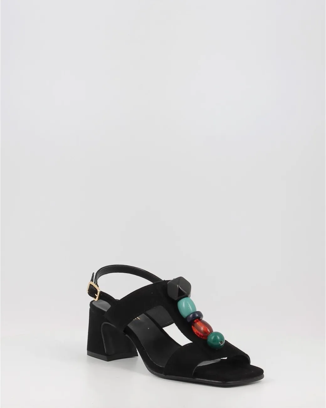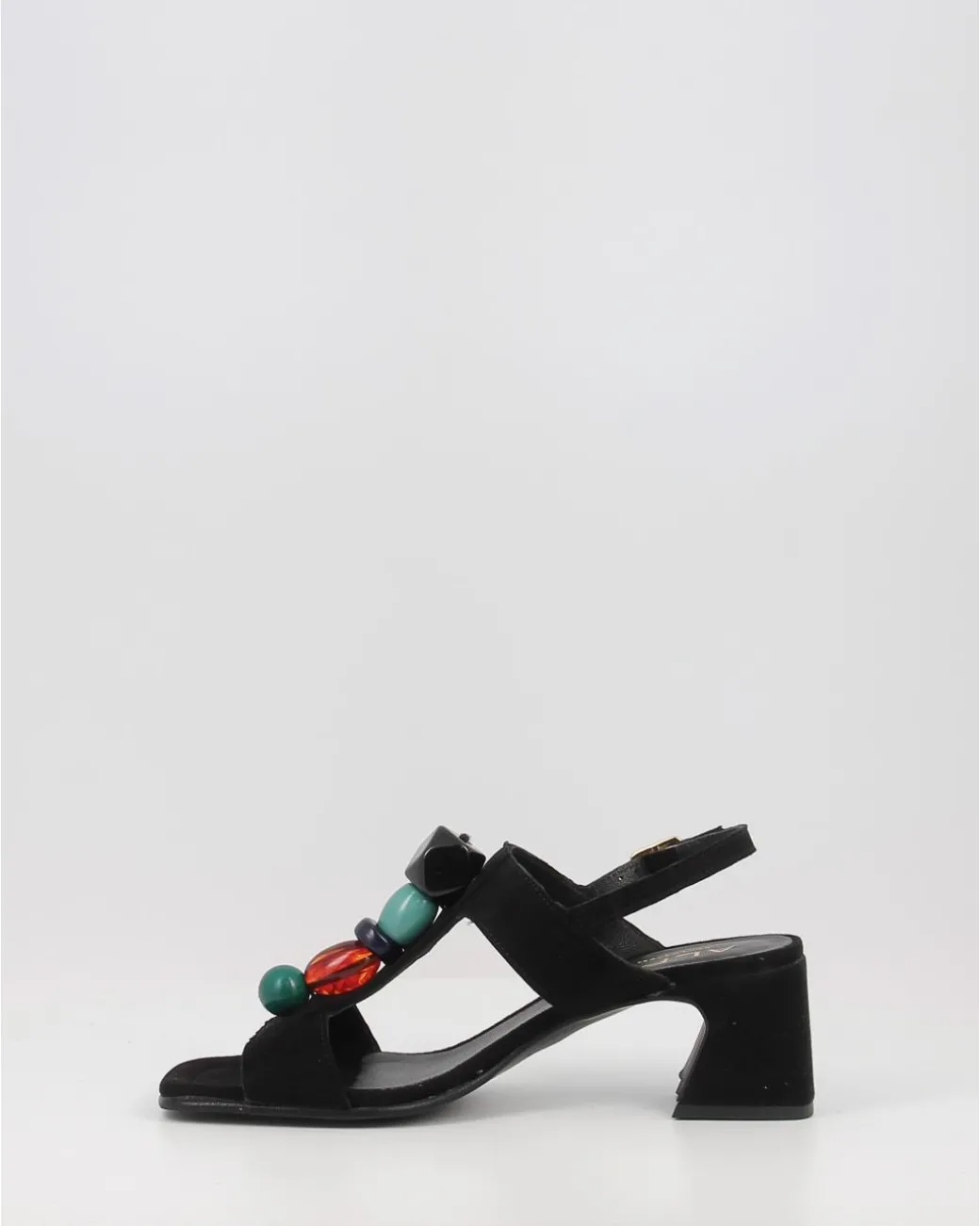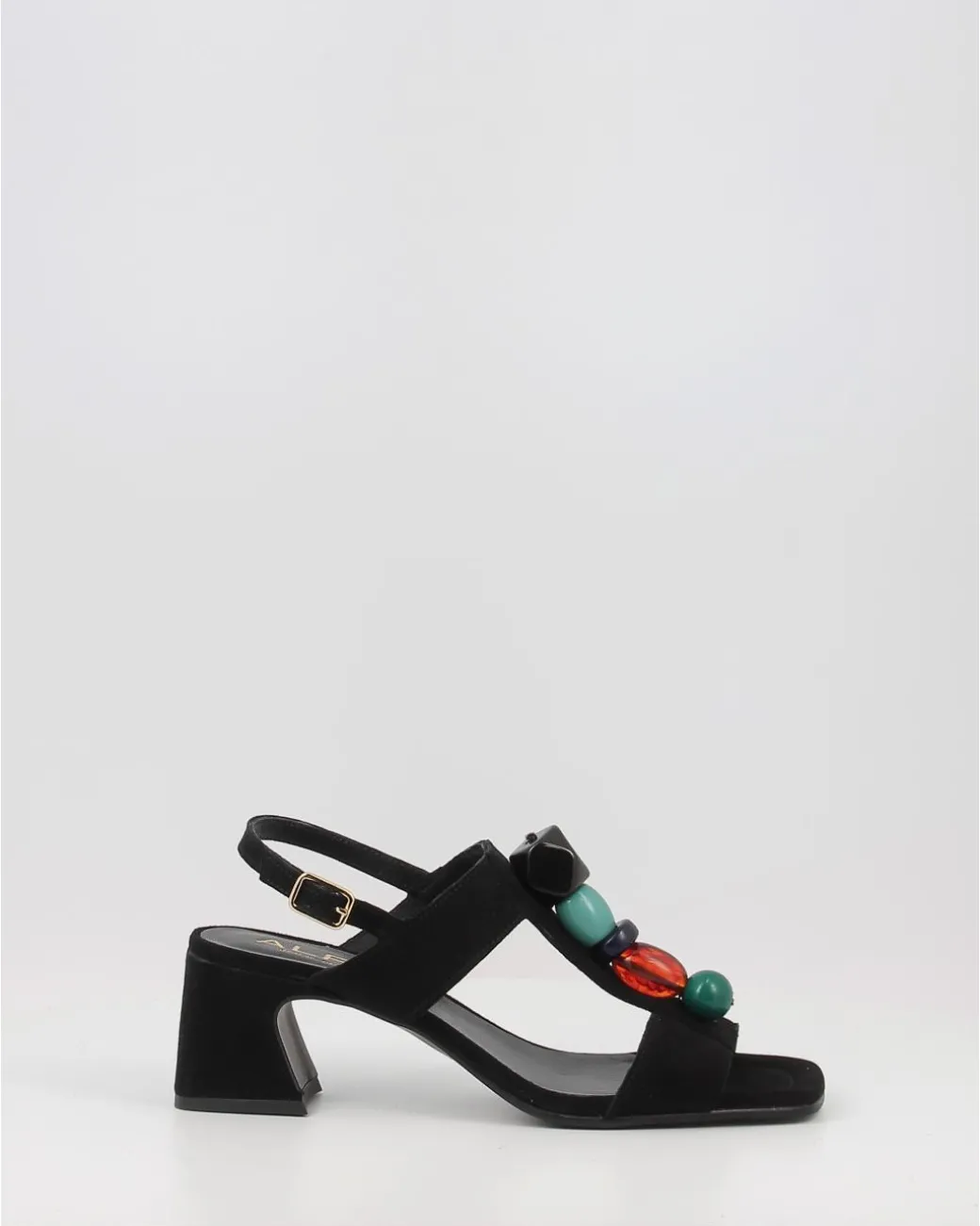 Sandalias Alpe De Piel Baby Silk De Tacon Medio. Poseen Dos Bandas Horizontales Unidas Por Una Vertical. Esta Ultima Banda Tiene Pedreria Ornamental Con Figuras Geometricas Esfericas Y Octogonales. Para Sujetar El Pie, La Parte De Atras Esta Compuesta Por Una Fina Correa Con Hebilla Y Agujeros Expansibles Para Mejor Ajuste Del Pie.
